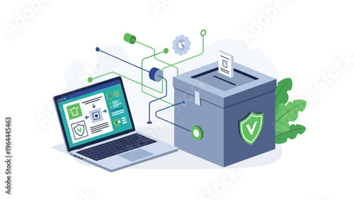 © Ndog, Fototapeta premium Secure Digital Voting System with Laptop and Ballot Box.