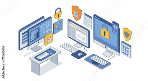 Obraz premium Secure digital workspace with isometric cybersecurity elements and modern...
