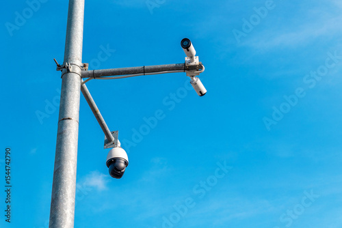 Fototapeta premium Security cameras mounted on pole against clear blue sky for surveillance