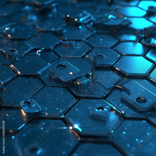 © Nain, Obraz premium Security concept. Futuristic surface with locks is located on hexagon. Trendy sci-fi technology background with hexagonal pattern. Minimal hexagonal grid pattern animation in light blue. 3D Render