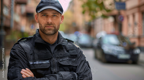 © Evgeniia, Fototapeta premium Security guard on the street. A male security guard patrols a protected area.