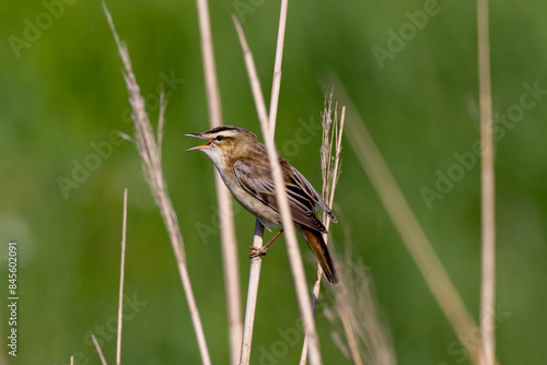 © Johan, Fototapeta premium Sedge warbler singing in the reeds
