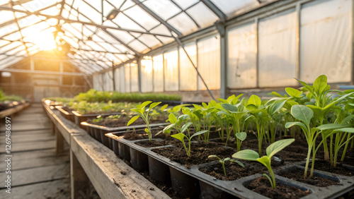 Fototapeta premium Seedlings growing in a greenhouse under warm sunlight