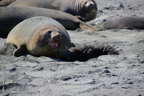 © Claudia, Fototapeta premium Seeelefant Baby und Mutter am Strand