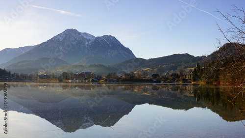 Obraz premium Seepanaorama mit Bergen am Altaussee / Österreich