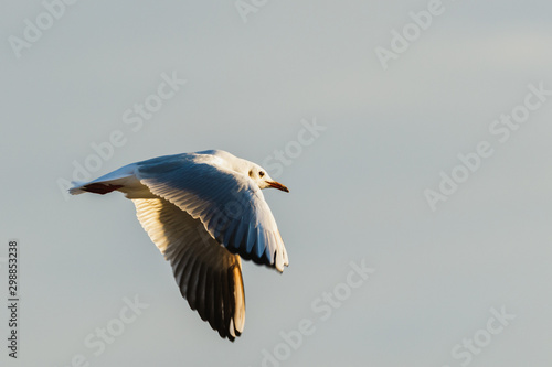© Raymond, Obraz premium Seevogel fliegt vor Himmel mit Wolken