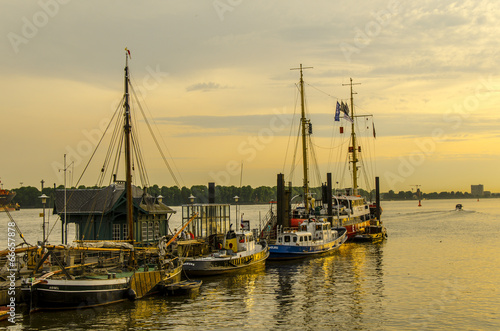 © dietwalther, Fototapeta premium Segelboote bei Sonnenuntergang im Museumshafen Hamburg