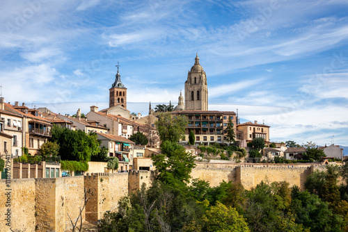 © Cleop6atra, Fototapeta premium Segovia, Spain skyline with Segovia Cathedral at the top, churches, medieval architecture, residential buildings and city walls.
