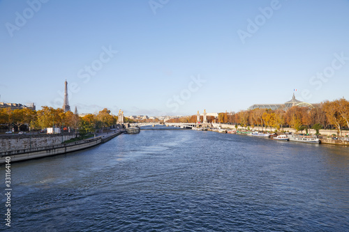 Obraz premium Seine river view with Eiffel tower and Alexander III bridge wide angle view in a sunny autumn day in Paris