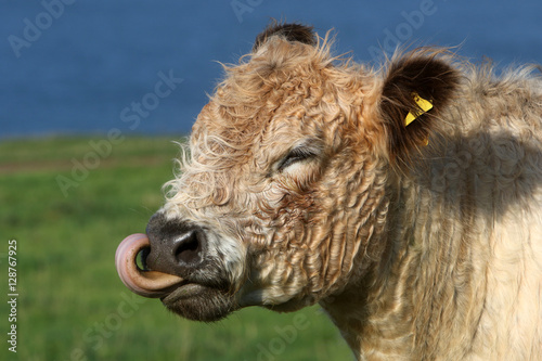 © nightsphotos, Fototapeta premium Seitliches Portrait eines Galloway-Rinds mit Zunge