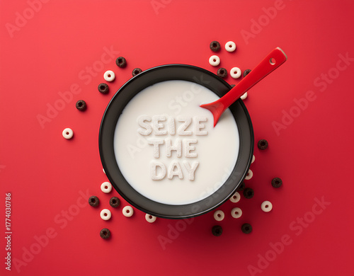 © image@9, Naklejka premium “Seize the Day” Cereal Letters in Milk Bowl on Bold Red Background