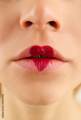 Obraz premium Seksowne usta z wiśniową farbą w kształcie serca, zbliżenie