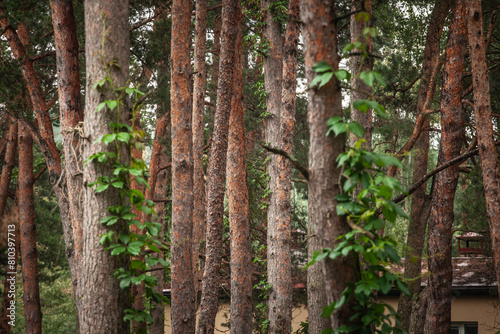 Fototapeta premium Selective blur on trunks of pine and fir trees in a typical eastern european...