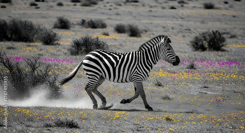 © Zea Stock ID, Fototapeta premium Selective Color Stripped Zebra Running Through a Flower Field Landscape