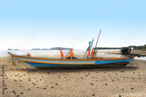 © CHAM, Fototapeta premium selective focus, a fisherman boat with flags and engine parking on the beach with blue sky in the background