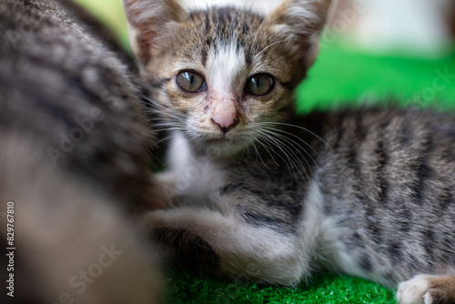 Naklejka premium Selective focus: A little gray and white striped kitten is sleeping comfortably next to its mother cat on the artificial grass in a green house.