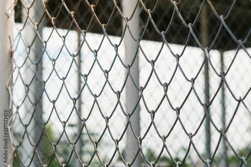 Fototapeta premium Selective focus Chain Link fence against blurred inside roof structure,...
