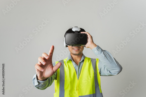 © ME Image, Fototapeta premium Selective focus hand. Asian man Architect or Engineer designer using VR headset with joystick for design working in studio short gray background.