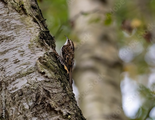 © Kev Kindred/Wirestock Creators, Obraz premium Selective focus of a bar-tailed treecreeper on a tree trunk with blurred background