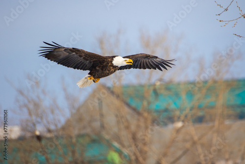 Obraz premium Selective focus of an eagle in flight