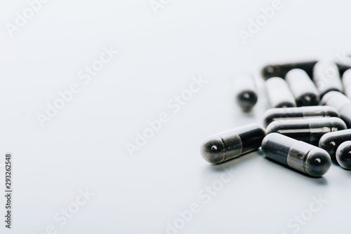 © LIGHTFIELD STUDIOS, Naklejka premium selective focus of black pills on white background with copy space