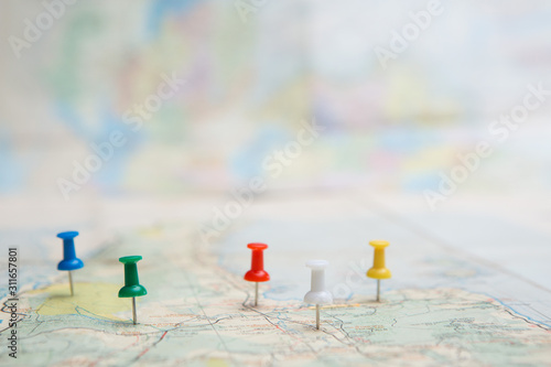 © chalongrat, Naklejka premium Selective focus of Colorful Many pins on map background