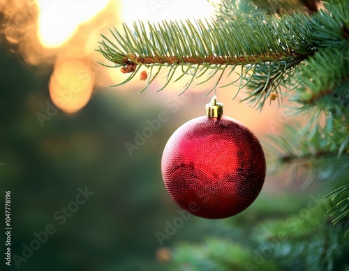 © IrenaBlechova, Obraz premium selective focus of red christmas ball on pine branch