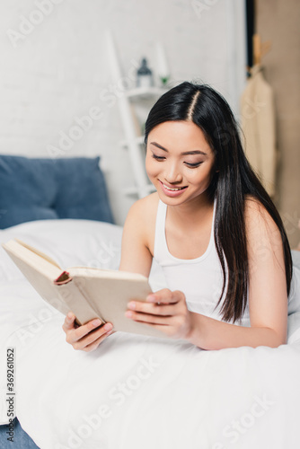 Fototapeta premium Selective focus of smiling asian woman reading book in bedroom