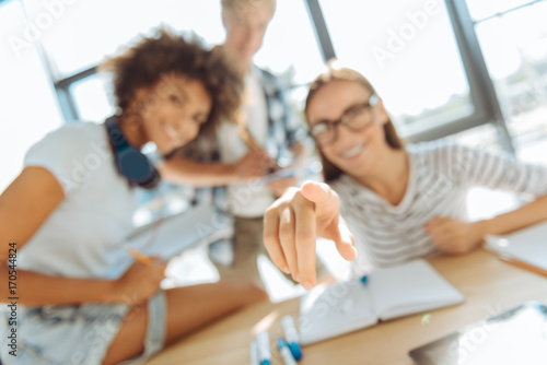 Fototapeta premium Selective focus of students hand pointing you