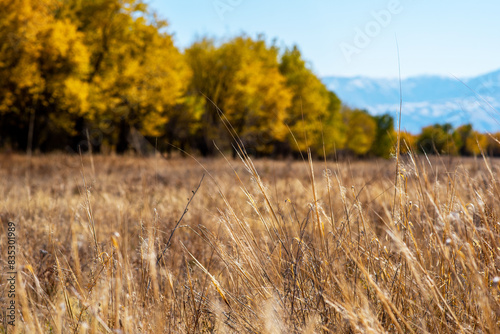 © eskstock, Obraz premium Selective focus of tall grass waving in the wind. Yellow wild grass against the backdrop of a autumn tress and mountain range. Beautiful landscape with amazing cloudy sky.