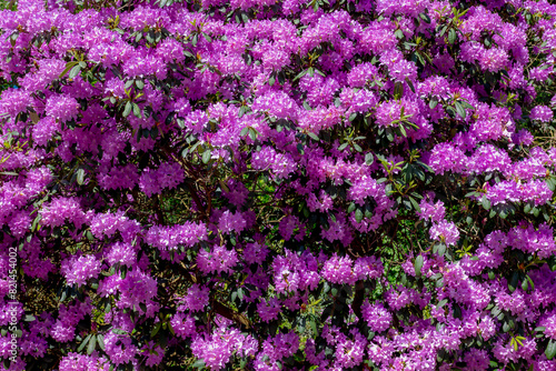 © Sarawut, Naklejka premium Selective focus of violet purple flower full bloom on the tree with green leaves, Rhododendron is a very large genus of species of woody plants in the heath family, Ericaceae, Nature floral background