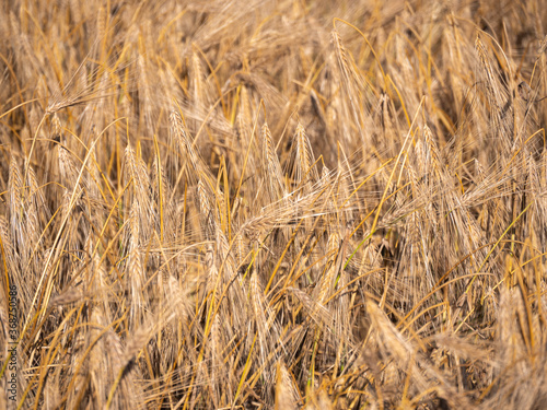 © photoexpert, Fototapeta premium Selective focus of yellow barley in golden meadow