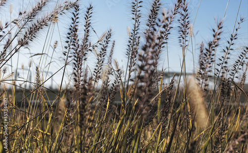 Fototapeta premium Selective focus on tall blades of golden grass on a clear summer afternoon...
