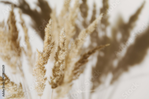 © magic_cinema, Fototapeta premium Selective focus - Pampas grass branch on pastel neutral beige background. Flat lay. Minimal, styled concept for bloggers with reeds foliage, sun light and trendy shadow.