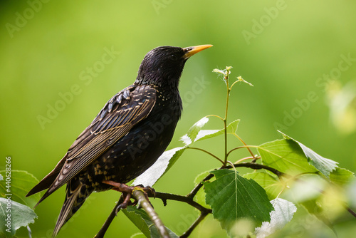 © Gints, Fototapeta premium Selective focus photo. Starling bird on tree.