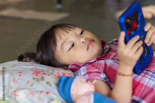 © waridsara, Obraz premium Selective focus. Portrait​ image​ of​ 2-3​ years​ old​ baby.​ Happy​ Asian​ child​ girl​ using and​ playing​ a​ smart Phone.​ She laying on the bed.