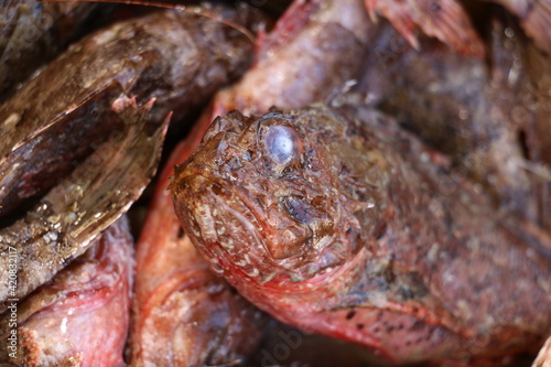 © Emrah, Naklejka premium selective focus. Scorpion fish at the fish stall in Istanbul