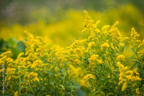 Fototapeta premium Selective focus shot of green grass and yellow flowers on a meadow