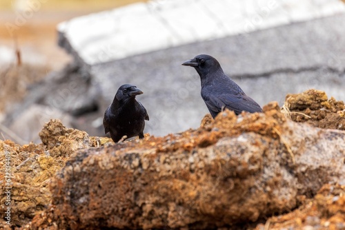 Obraz premium Selective focus shot of two crows perched on a brown rock