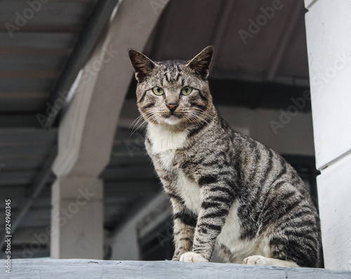 © Rahman Ar-Rizqi, Fototapeta premium Selective focus stray cat or white tabby domestic cat looking at the camera while monitoring from above standing upright on the fence of the house during the day