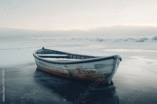 © Chin, Naklejka premium Selective focus wooden boat in frozen lake in winter, Landscape view of glacier with fisherman boat.