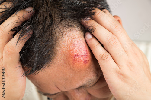 © ThamKC, Naklejka premium Selektywne skupienie się na bolesnym obrzęku czoła czerwonego