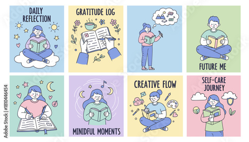 Fototapeta premium Selfcare and journaling routine vector set reflection gratitude mindfulness and creative flow illustrations