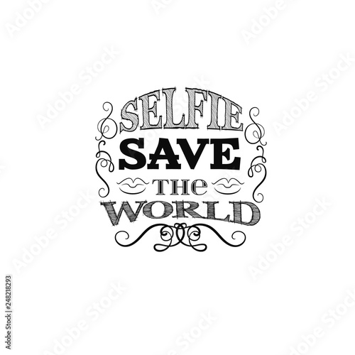 Fototapeta premium Selfie save the world. Quote typographical background. Vector illustration with hand drawn elements scrolls swirls curles. Template for poster, business card, t-shirt, bag, sweatshirt, banner.