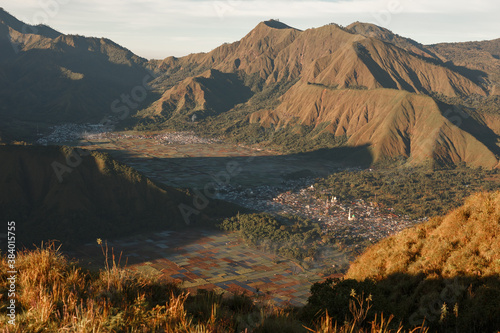 Fototapeta premium Sembalun village landscape in east lombok filled with fog in the morning, view from Pergasingan Hill