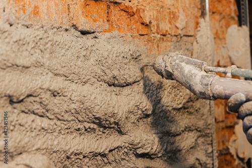 Obraz premium Semi-automatic wall plastering process. The plaster solution is thrown out of...
