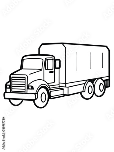 © Shoraoddi_Hossain, Fototapeta premium Semi-truck or box truck line art outline. Simple black and white illustration of a delivery truck, perfect for coloring pages and graphic resources.