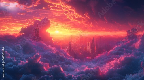 Fototapeta premium Semiabstract city skyline at sunset with glowing neon outlines of skyscrapers and vibrant swirling clouds representing modernity and urban energy