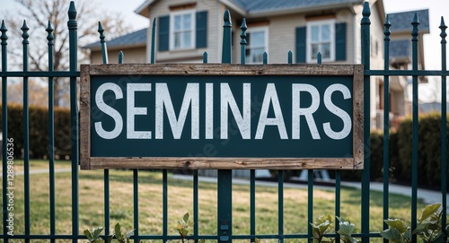 © Erlinda, Obraz premium seminars lettering on sign at fence with house background