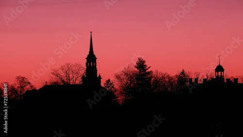 © Nina, Obraz premium seminary ridge museum ans church of abiding presence on seminary ridge in gettysburg, pennsylvania, against a pretty pink winter sunrise